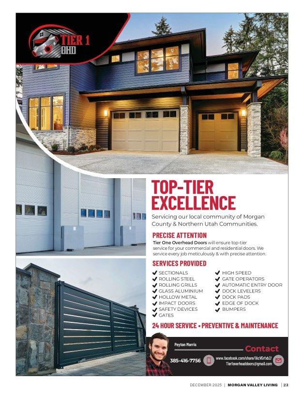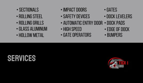 Tier One Overhead Doors will ensure top-tier service for your commercial and residential doors. We service every job meticulously & with precise attention. Contact# (385-416-7756) Services Provided: Sectionals Rolling Steel Rolling Grills Glass Aluminum Hollow Metal Impact Doors Safety Devices Gates High Speed Gate Operators Automatic Entry Door Dock Levelers Edge Of Dock Dock Pads Bumpers Preventative Maintenance