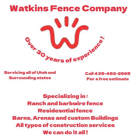 Watkins Fence provides quality at competitive prices. We strive to give you the best customer service and pride ourselves in helping our customers with their project dreams. Whether it’s a large or small ranch development project or a new fence to make your backyard look new again, WATKINS FENCE is here to help. Also, we do more than just fences. We can do a patio with a cover and a nice wood deck or even a barn or tool shed. Give us a call for your next project let us help Get it done.